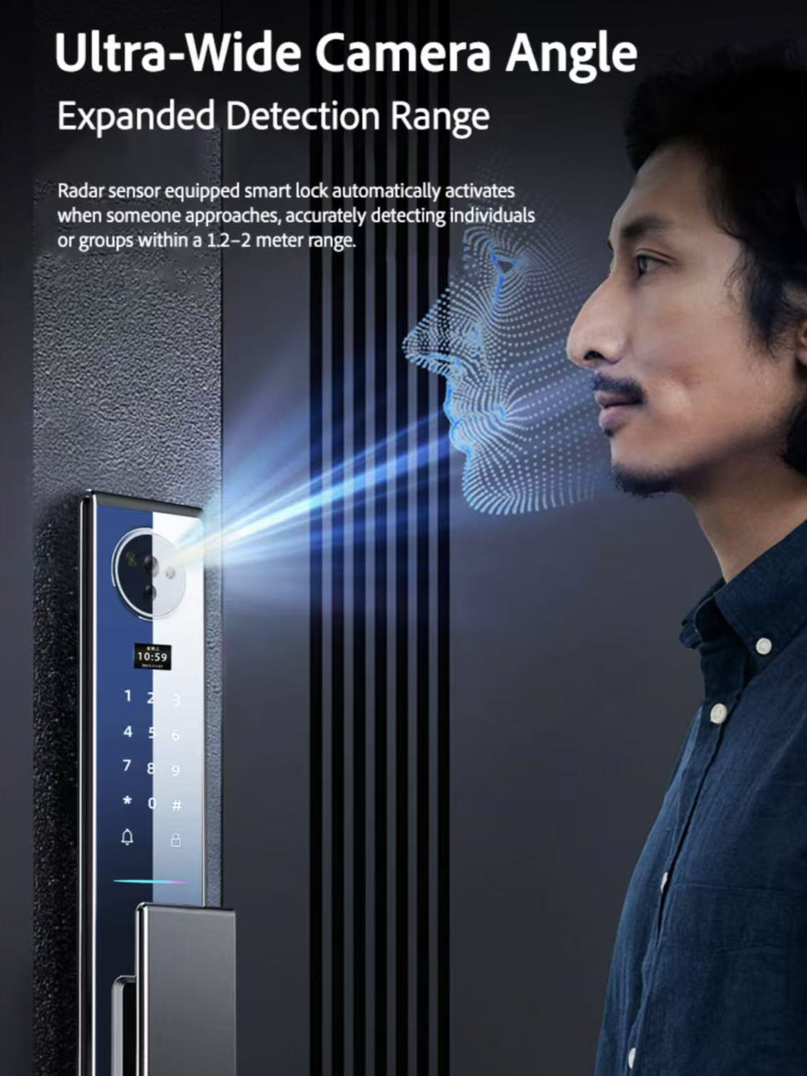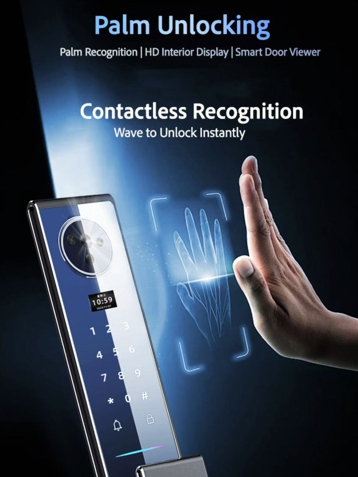 Experience the most advanced security: unlock with palm, 3D face recognition, fingerprint, pin code, card, mobile app or key. This versatile digital lock uses the newest technology, but in a stylish new design, giving you easy keyless entry.