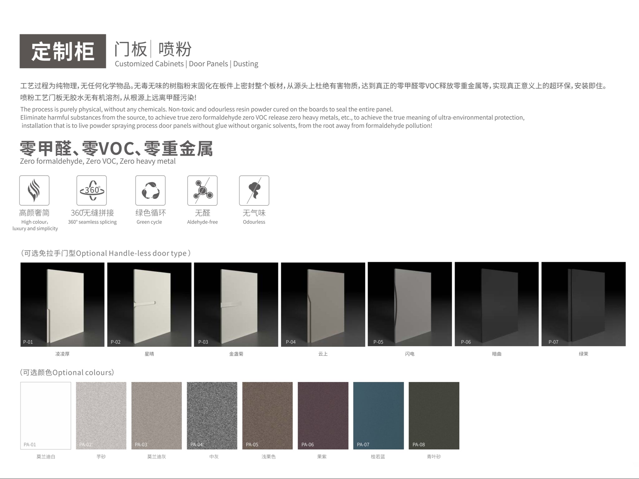 Highly favoured in contemporary wardrobe design, powder coating doors are made by applying a fine powder to a metal surface and curing it under heat to form a strong, uniform finish. The entire process is entirely physical and free from harmful chemicals. The non-toxic, odourless powder eliminates harmful substance use from the source to ensure zero formaldehyde, heavy metal, and VOC emissions, making it ultra–eco-friendly and safe for immediate use after installation.